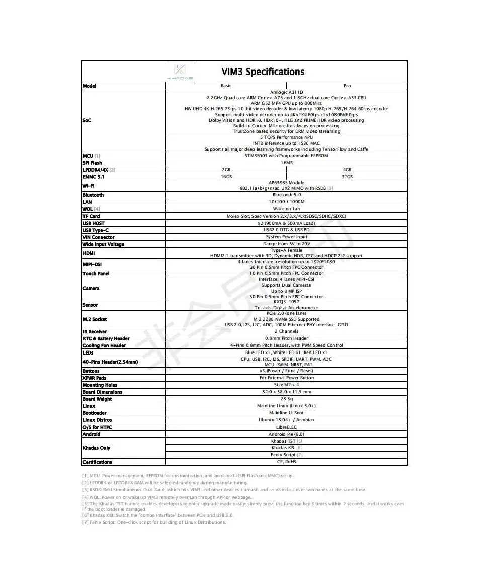 The VIM3 Pro SBC is the latest addition to our popular Khadas VIM series. It has a powerful Amlogic A311D SoC: x4 Cortex A73 performance cores (2.2Ghz), and x2 Cortex A53 efficiency cores (1.8Ghz) are merged into a hexa-core configuration and fabricated with a 12nm process to maximize performance, thermal and electrical efficiency.