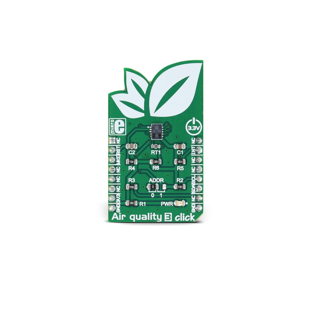 MIKROE AIR QUALITY 3 CLICK (MIKROE-2953) – eCO₂ & TVOC Air Quality Sensor Board is the air quality measurement device, which is able to output both equivalent CO2 levels and total volatile organic compounds (TVOC) concentration in the indoor environment. The Click board™ is equipped with the state-of-the-art air quality sensor IC, which has an integrated MCU and a specially designed metal oxide (MOX) gas sensor microplate, allowing for high reliability, fast cycle times, and a significant reduction in the power consumption, compared to other MOX sensor-based devices. The Click board™ is also equipped with a temperature compensating element, which allows for increased measurement accuracy.