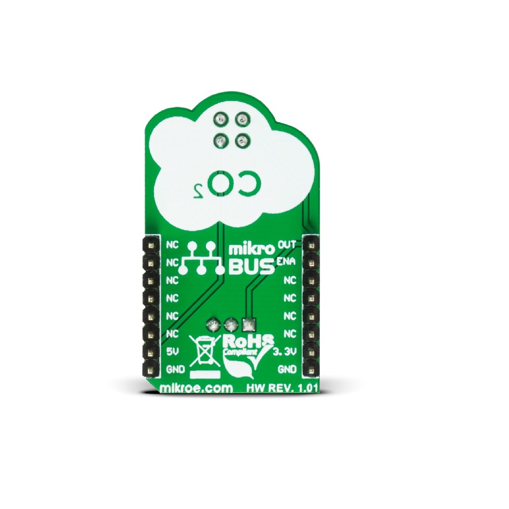Pollution click is designed to run on a 5V power supply. It communicates with the target MCU over AN and RST pin on the mikroBUS™ line.