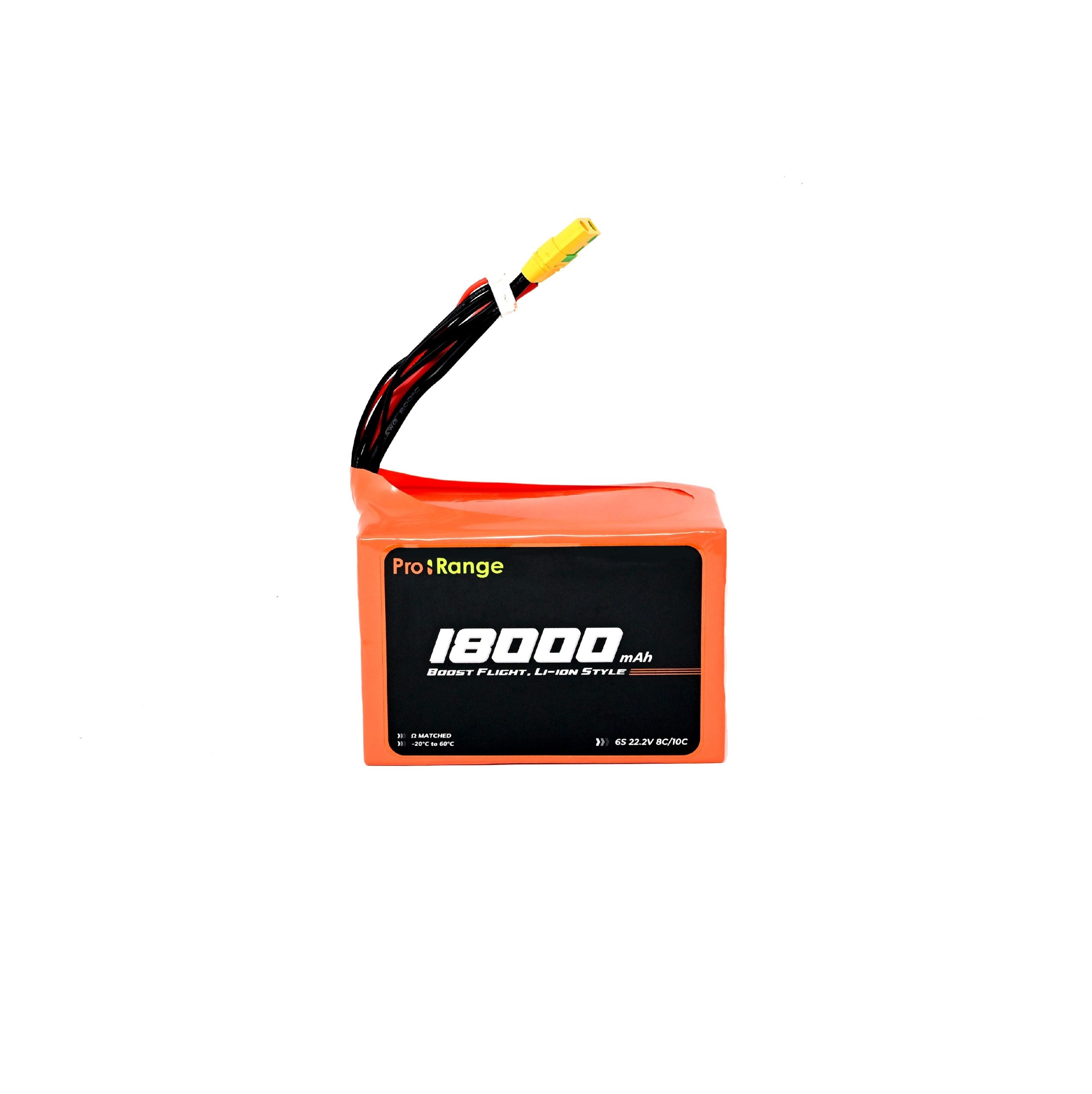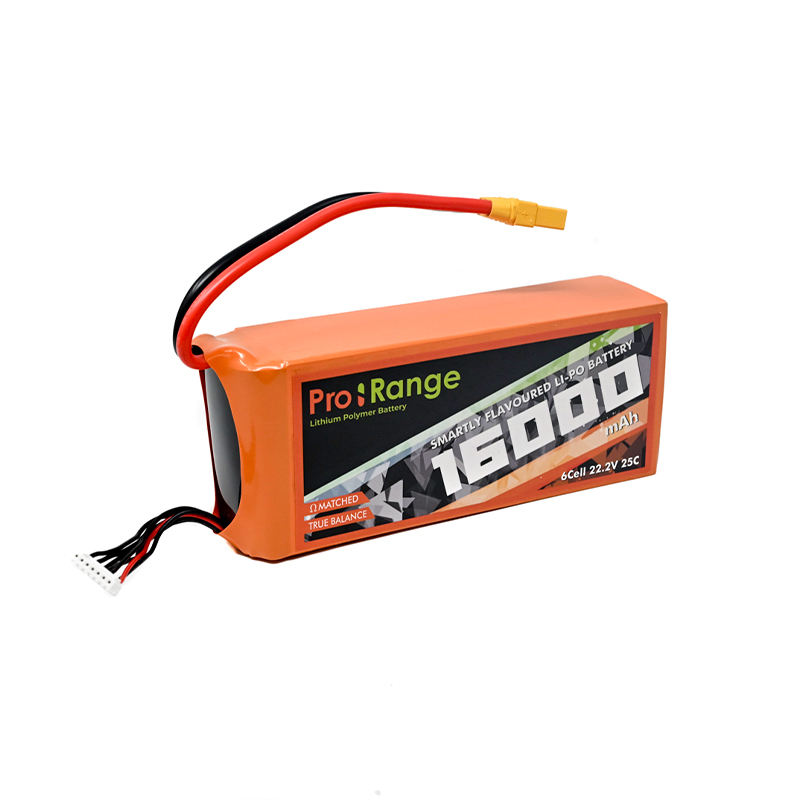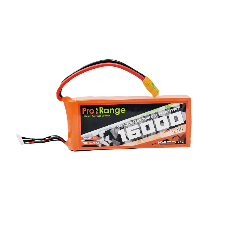 The Pro-Range 22.2V 16000mAh 6S 25C Lithium Polymer Battery Pack is built for users who demand reliable power, high discharge performance, and long service life in drones and RC applications. Manufactured using IR-matched cells, it delivers stable voltage, efficient energy output, and consistent capacity under heavy loads.