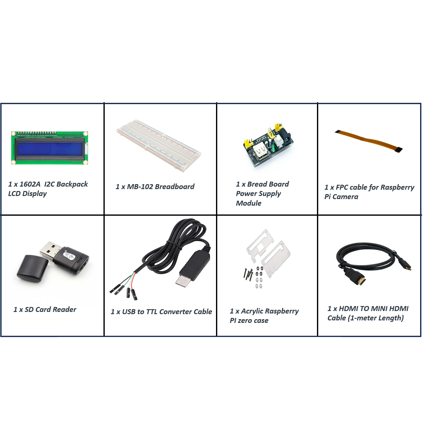 In this Universal Pro-Range kit for all variants of Pi Zero Model, we have included mainly Mini HDMI to HDMI cable, SD card Reader/Writer, 16GB High-Speed Class10 SD Card, and others which are required to get started with Pi Zero Board.