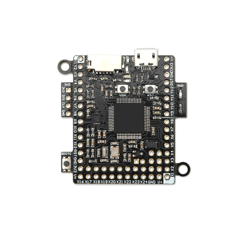 - On-board 3.3 V regulator, input voltage range 3.6 V–16 V, with DFU bootloader support for firmware updates.