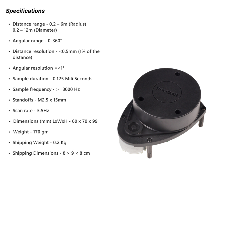 Note: 1.The range of this RPLiDAR is 6-meter if we are considering radius and 12-meter if we are considering diameter. So we can also name as RPLiDAR A1M8 360 Degree Laser Range Finder – 12M.