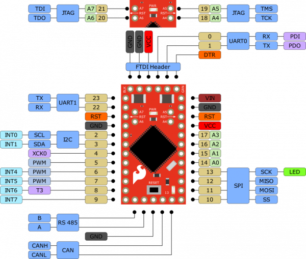 The SparkFun AST-CAN485 Dev Board is based on the Atmel AT90CAN128 processor. The processor runs at 16MHz, has 128kB or Flash, 4kB of SRAM and features a hardware CAN controller. The CAN485 breaks out commonly used communications ports and pin functions including I2C, SPI, UARTs, eight analog inputs, and six interrupt-enabled pins. Additionally, the AST-CAN485 is equipped with an onboard regulator, allowing for an unregulated input voltage to be supplied on the VIN pin to make the allowable input voltage range 7–16V. Please keep in mind, however, that 7–12V is recommended.