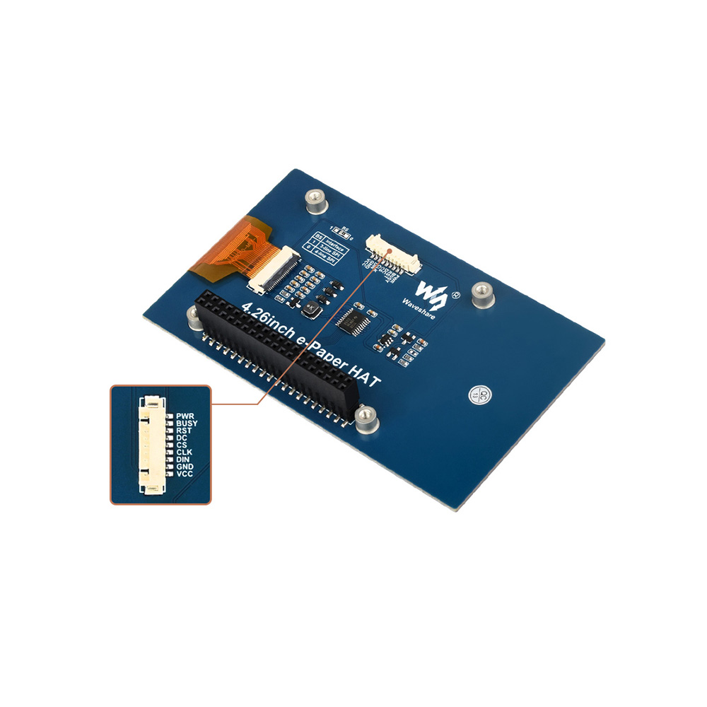 The 4.26″ E-Paper HAT offers a low-power, wide viewing angle display with a paper-like effect, ideal for applications such as price tags, shelf labels, and industrial instruments. With a resolution of 800×480 and over 170° viewing angle, it features SPI communication, compatibility with Raspberry Pi series boards, and onboard voltage translation for seamless integration with various controller boards. Its passive reflective display requires ambient light and supports partial refresh for efficient power consumption and persistent content display.
